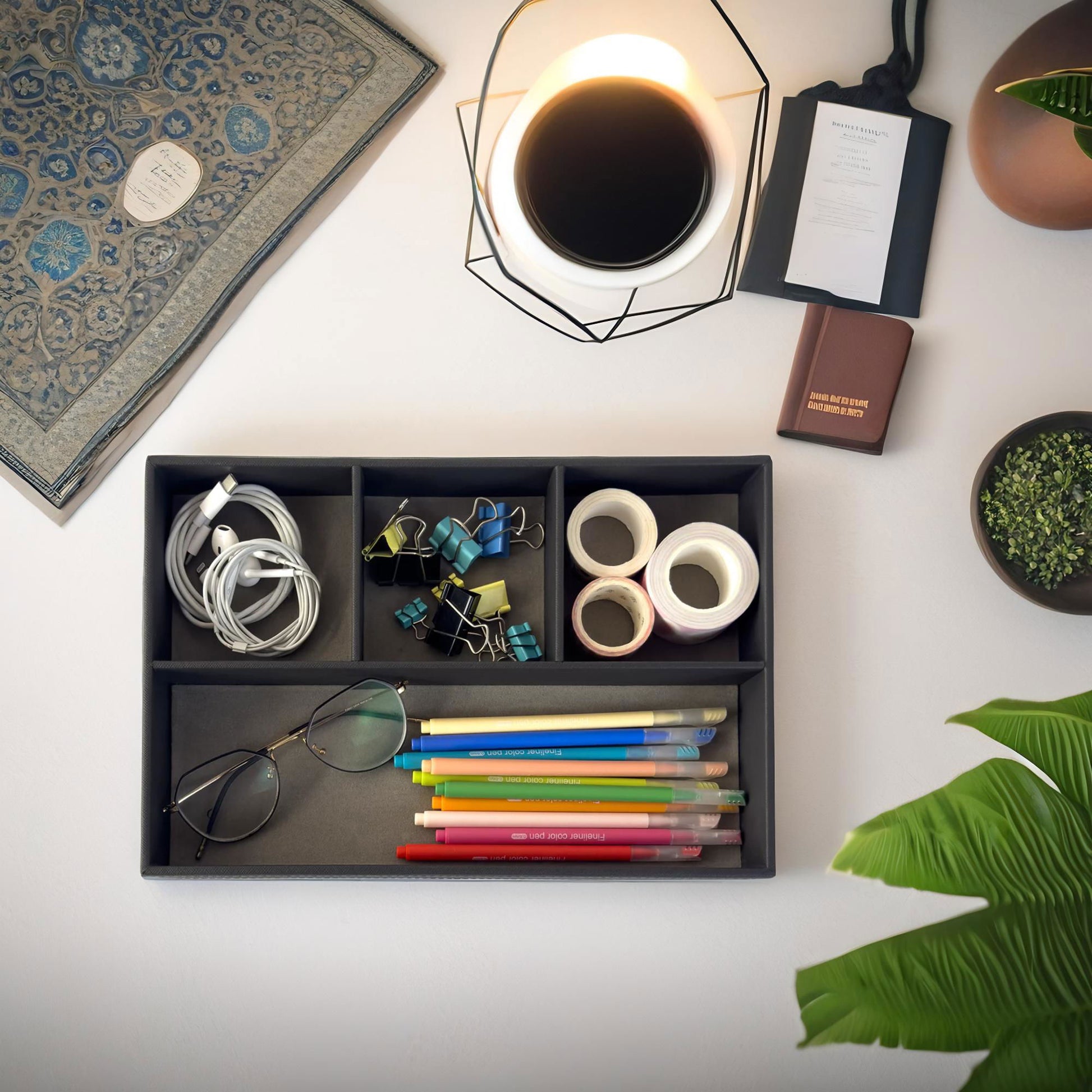 4 divided compartments to organize your writing instruments, pens, pencils, eraser, paper clip and other small office supplies