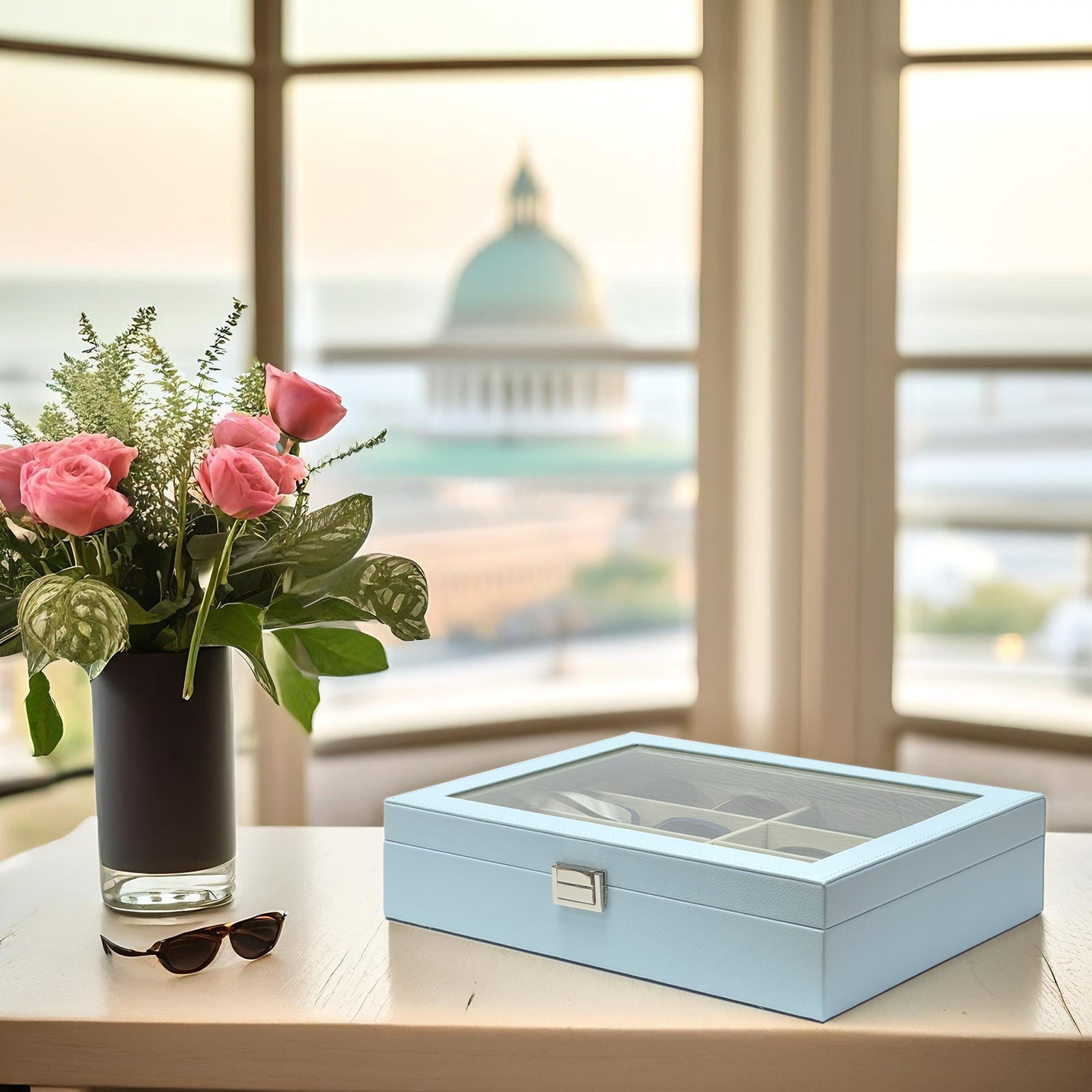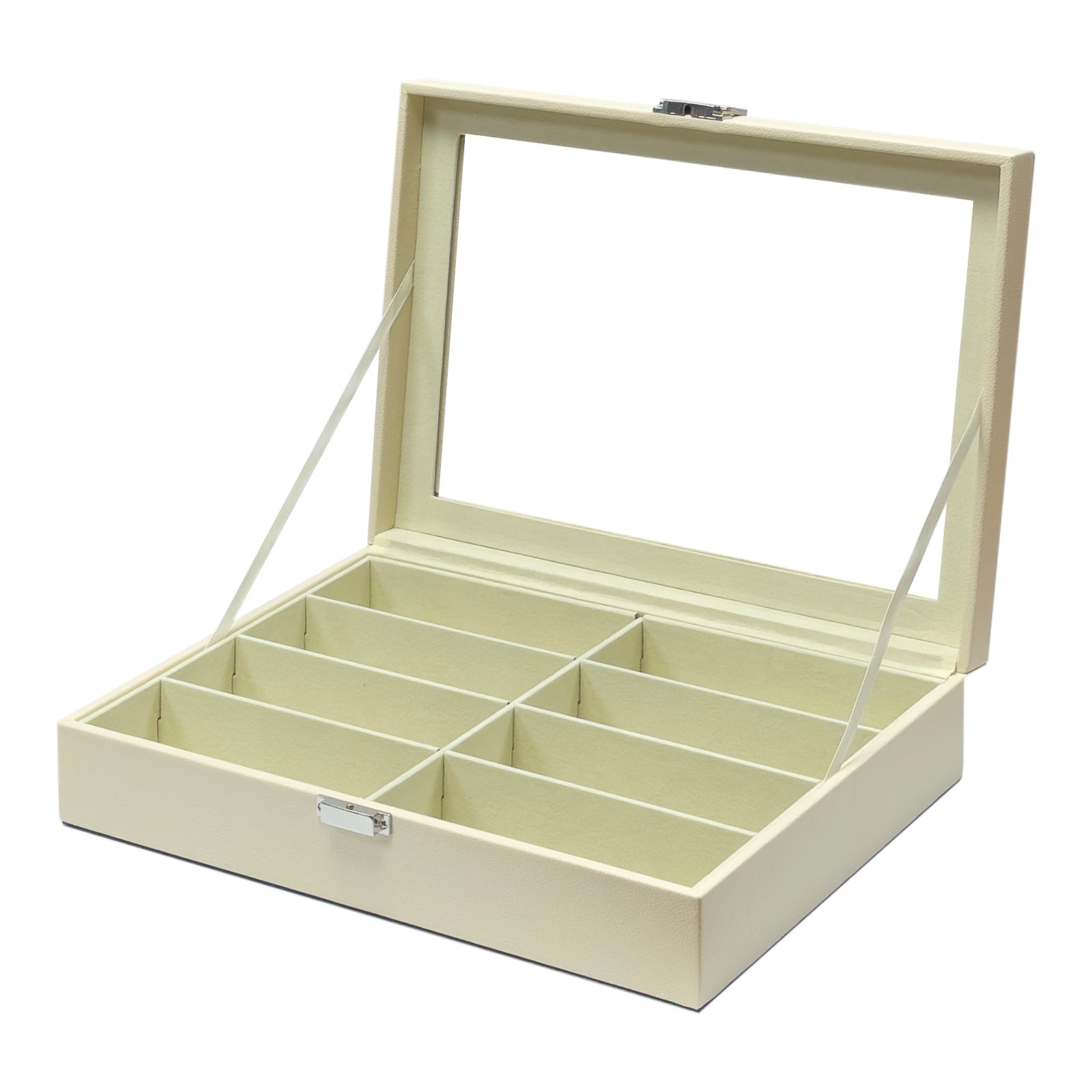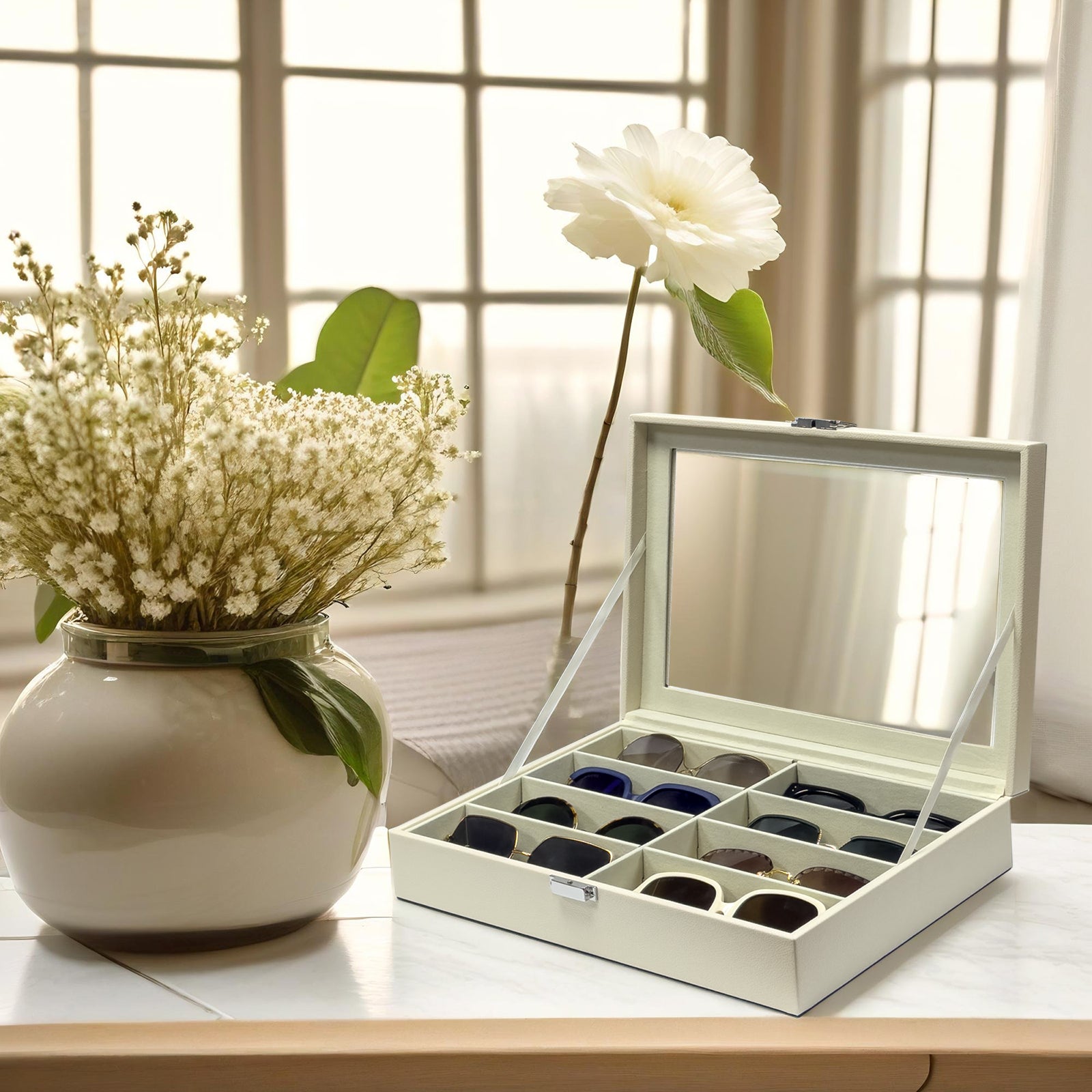 - 👓 Keep your sunglasses safe and scratch-free: This 8-slot sunglasses organizer is a must-have for anyone who owns multiple sunglasses and wants to keep them safe and scratch-free. With multiple compartments lined with interior soft flannelette material, solid MDF construction covered with durable faux leather, your sunglasses will be protected from scratches and dust