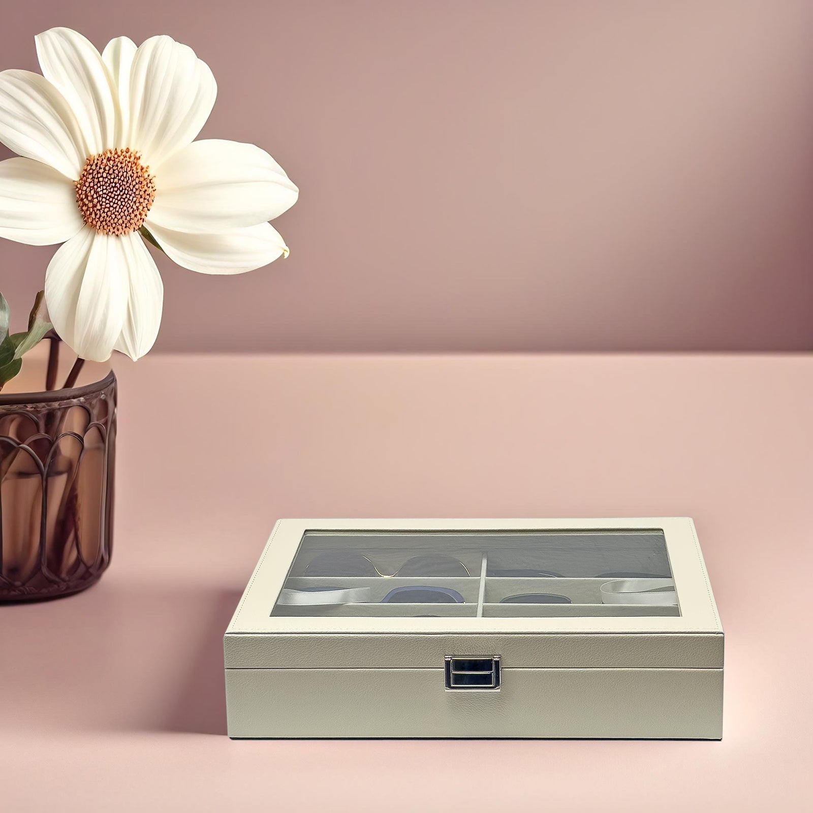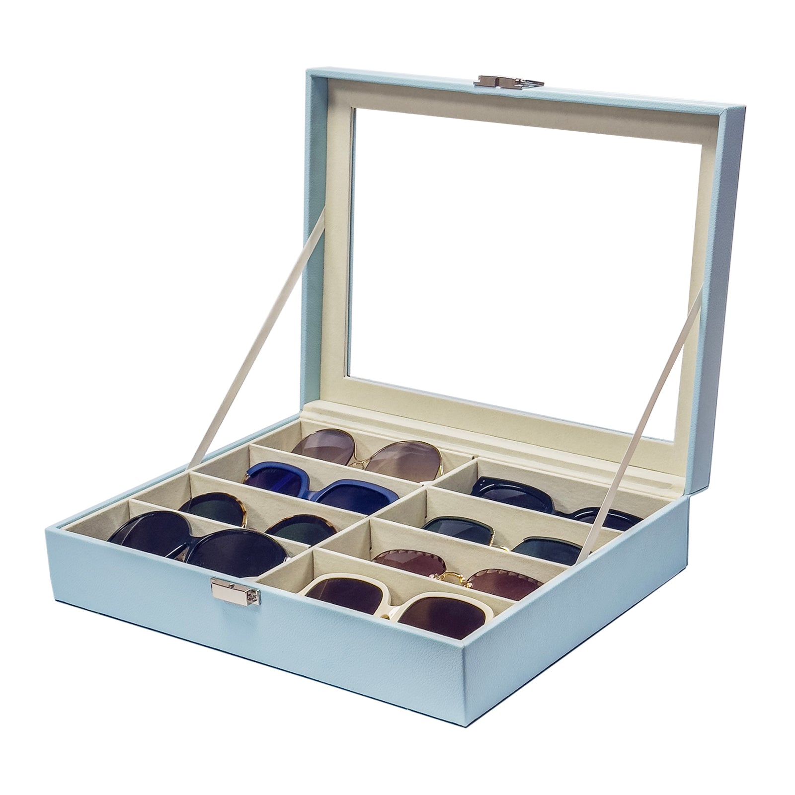 - 👓 Looking for a way to keep your multiple sunglasses organized, protected, and easily accessible? Look no further than this 8-Slots sunglasses organizer which is protective, stylish and space-saving. Approximate Dimensions: Exterior - 13" W X 3.2" H X 9.5" D; Each Interior compartment - 6.0" W X 2" H X 3" D